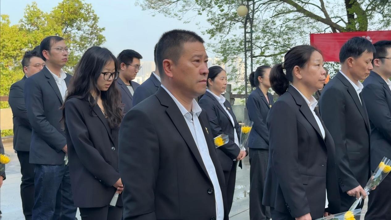 默哀结束后,董事长童海标缓步上前,仔细整理敬献的花篮,缎带上“革命先烈永垂不朽”的字样格外醒目。随后,全体人员依次缓步绕行纪念碑,逐一献上手中的鲜花,轻轻驻足瞻仰,以最朴素的方式表达对革命先烈的追思与敬仰,接受深刻的爱国主义和革命传统教育。
